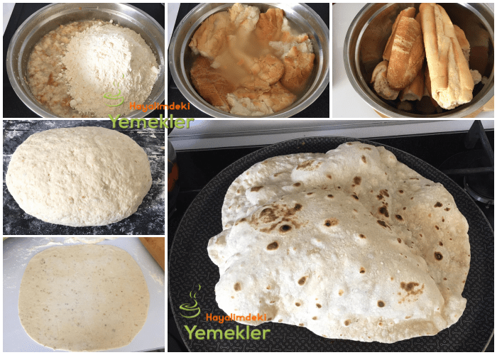 - Bayat ekmekleri aksamdan veya yarım önceden suya yatırıyoruz sabah suyunu iyice sıkıp üstüne tuz,alabildigi kadar un doküp yoguruyorup normal bir hamur yapıyoruz hamurumuzu dinlenmeye bırakıyoruz ve yumurta büyüklüğünde bezeler yapıp birazcık daha dinlendirin sonra merdane yardımıyla açın kızgın tavada yağsız önlü arkalı pişirin