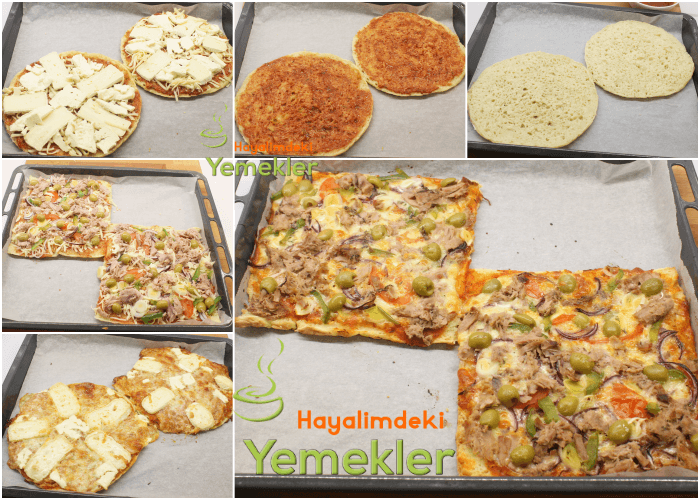 Bazlamanın üzerine Pizza sosunu gezdirdikten sonra Rendelenmiş kaşar peyniri İnce ince doğranmış kırmızı biber yeşil biber ton balığı,soğan (istediğiniz başka malzemelerde kullanabilirsiniz) yerleştirin. Üzerine çok az sıvıyağ,kekik ve tuz gezdirin.