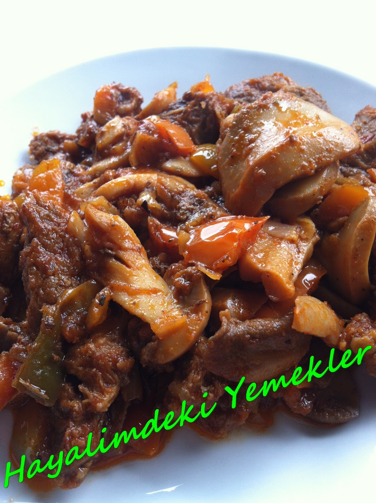 - baska bir tencereye once siviyagi koyun soğanlar sararana kadar soteleyin sonra biberleri soteleyin biberlerin üstüne eti ilave edin et kızarmaya başlayınca baharatları ve tuzu ilave edin iyice karıştırın salca güzelce sotelendikten sonra mantar koyun biraz karıştırıp sıcak suyu ilave edin kısık ateşte 10 veya 15 dakika pişirip ocaktan alin 10 dakika dinlendirip servis yapin
