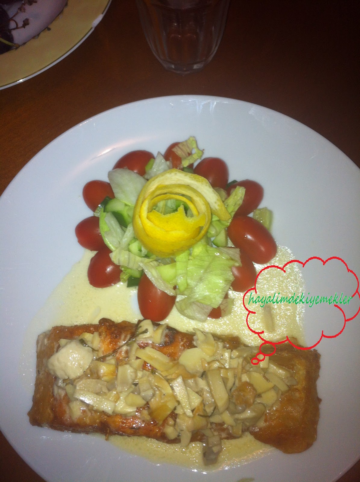 kizarma islemi biten somonlari servis tabagina alip onceden hazirlamis oldugunuz krem fraicheli mantar sosunu uzerine dokup servis yapabilirsiniz.ben yanina kiraz domatesli coban salata hazirlayip servis yaptim salata seciminiz size kalmis