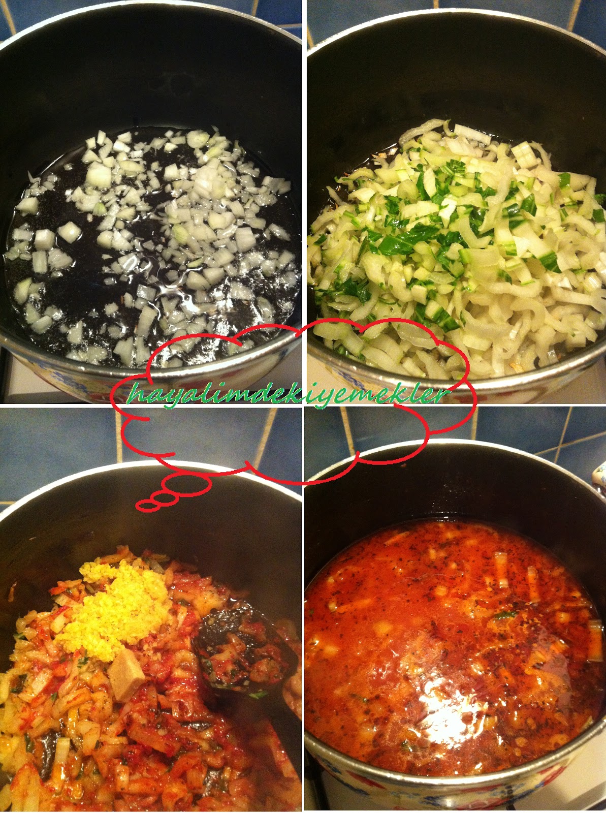 - siviyagi,sogani tencereye koyup soganlar sararana kadar kizartip pazi saplarini ilave edip soteleyin