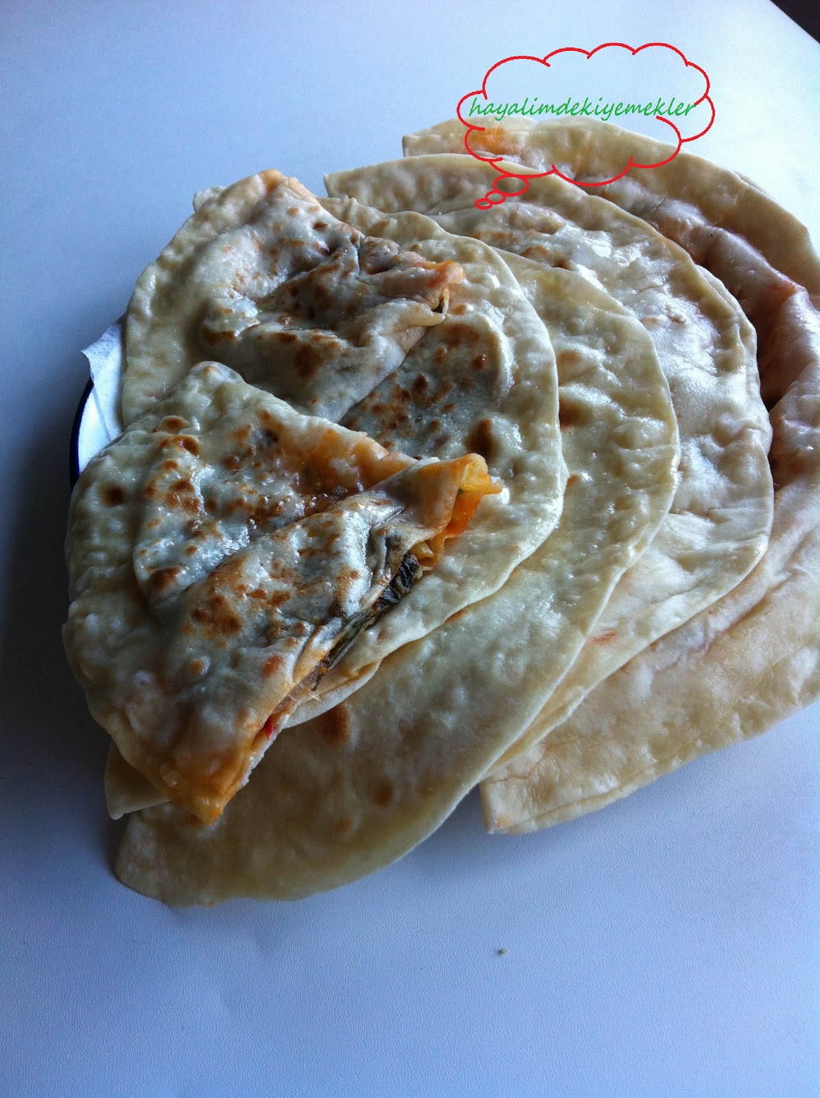 bezeleri unlayarak merdane yardimiyla buyuk bir servis tabagi kadar acin resimdede goruldugu gibi 1veya 2 kasik pazili harci yufkanin yarisini kaplayacak sekilde yayip bos tarafida pazinin uzerine kapatin.