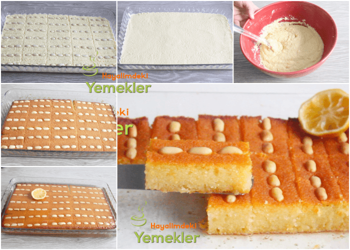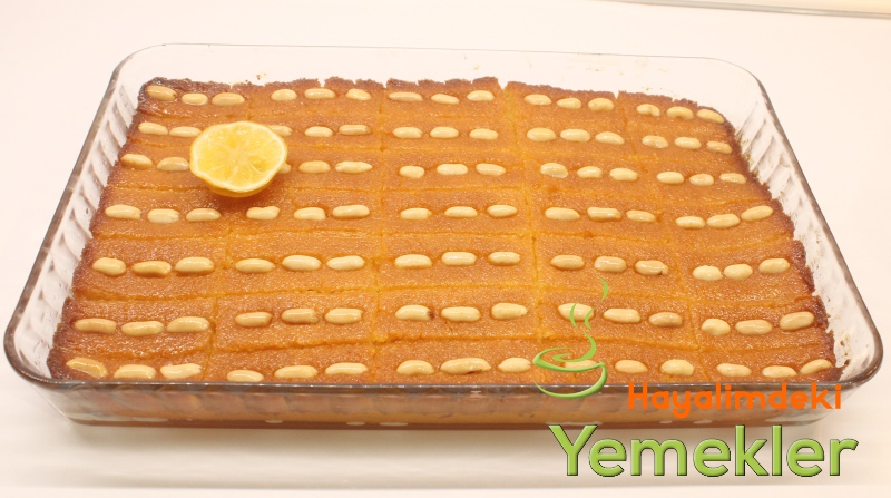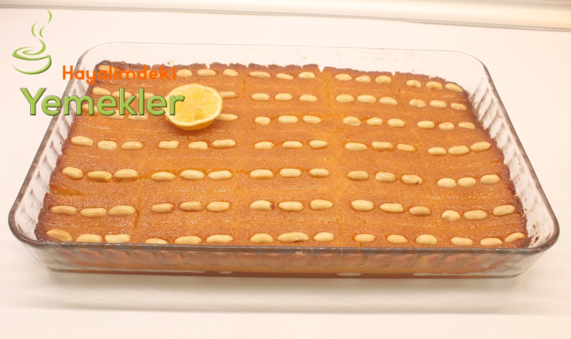 - Şam tatlısı için irmik, yoğurt, tozşeker, kabartma tuzu, şekerli vanilin bir kaba alınarak iyice karıştırılır, tereyağı ile yağlanmış büyük boy borcama dökülerek spatula ile düzeltilir, vaktiniz varsa buzdolabında 1 saat dinlendirin Üzerine çizikler atarak dilimleri ayırın ama kesinlikle tabanına kadar kesmeyin. Üzerini tuzsuz fıstık ile süsleyin.
